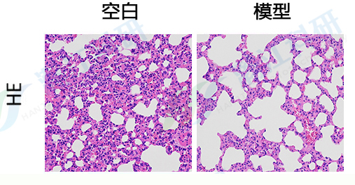 与空白组相比,模型组小鼠肺组织HE染色可见大量肺泡结构破坏,甚至塌陷、融合,炎性细胞浸润