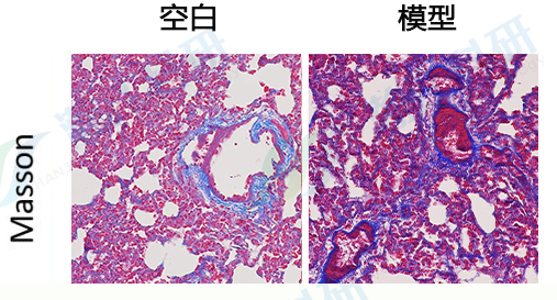 与空白组相比,模型组小鼠肺组织Masson染色显示肺泡间隔大量的蓝色胶原沉积